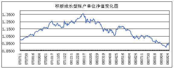 固定收益配置上,基于债券市场中长期趋好的判断,该账户固定收益配置和流动性管理组合在三季度继续加仓,组合总仓位已提升至55%以上,投资品种仍选择相对投资价值较高的3年期以内品种,同时适当投资部分超长期国债以提高组合整体久期水平。在2008年三季度债券市场大幅上涨行情中,该组合给予积极成长账户报告期内提供了较高的净值增长收益。目前该账户固定收益配置组合加权平均剩余期限接近3.5年,较2007年底提高约1.1年;债券组合加权平均收益率为4.63%,较2007年底提高近30bp。