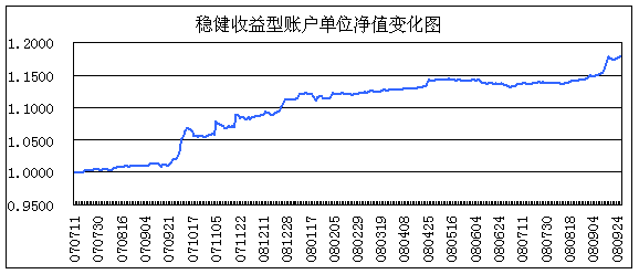 基于宏观基本面、政策面和市场面判断,2008年三季度稳健账户固定收益仓位进行了大幅超配,投资品种选择除重点配置相对收益率更高和未来骑乘下滑收益更明显的3年期以内中短期品种外,注重对长久期固息国债、金融债和高资质信用品种(公司债、分离债等)的投资,以有效提高该账户的久期水平。