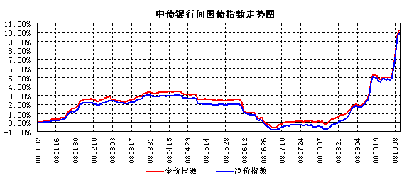 2008年8月份中下旬债市出现大幅反弹,银行间中债国债净价指数月度累计上涨1.44%,收益率整体下降约25-30bp左右。债券市场大幅反弹的主要原因有两方面:首先是基本面、政策面和资金面等因素的配合,特别是中长期经济走势预期大幅趋缓、通胀走势回落、奥运期间政策真空预期、资金面回暖等多种因素的综合影响;其次,股票市场继续出现大幅下跌,避险资金特别是基金等机构大幅增持投资价值相对较高的债券等固定收益品种。